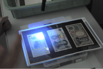 鉱石やお札にブラックライトを当てると…、普段光って見えないところが光って見える!